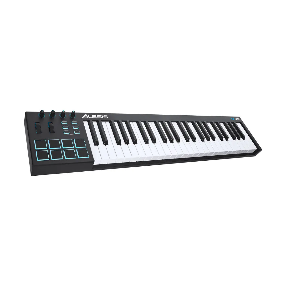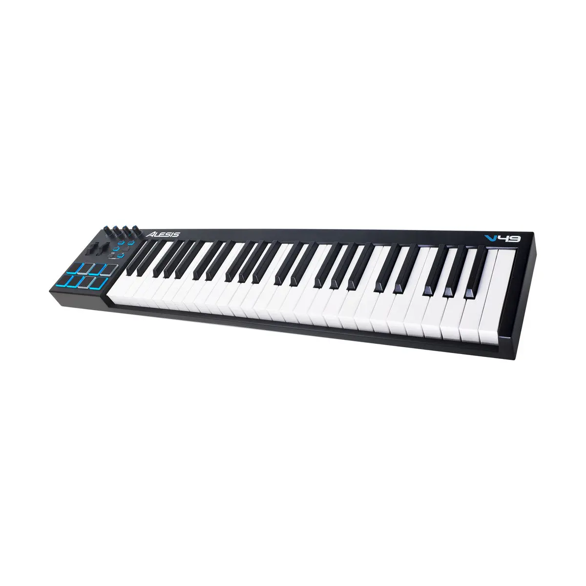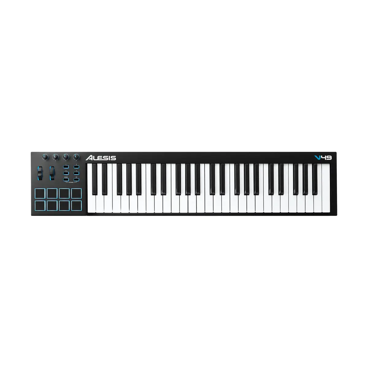 El Alesis V49 es un controlador MIDI potente e intuitivo que te permite controlar tu software musical con una serie de pads, perillas y botones. Con 49 teclas de tamaño completo sensibles a la velocidad y botones de octava arriba/abajo, puedes ampliar el teclado a todo el rango melódico y tocar líneas de bajo, acordes y melodías. El V49 también cuenta con cuatro perillas y botones asignables para manipular plugins de efectos e instrumentos virtuales: abrir y cerrar filtros, ajustar el volumen, activar efectos, modificar parámetros y mucho más. Ocho pads retroiluminados sensibles a la velocidad te permiten lanzar clips o tocar la batería con los dedos con una respuesta excepcional, y las ruedas de tono y modulación amplían la expresividad de tu interpretación.