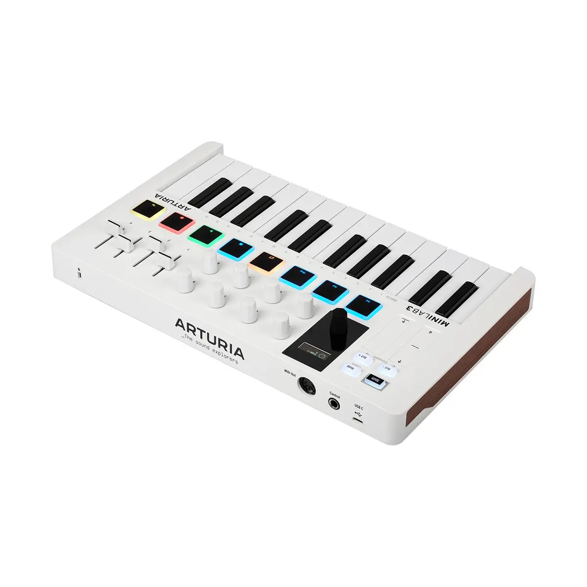Crea música desde el primer momento con el Arturia MiniLab 3 blanco , un controlador USB-MIDI portátil que viene con un paquete completo de software de producción de audio. Con alimentación por bus USB, este controlador de veinticinco teclas sensibles a la velocidad incorpora un banco doble de ocho pads de interpretación retroiluminados, sensibles a la velocidad y a la presión, ocho controles rotatorios, bandas táctiles capacitivas de alta sensibilidad para pitch bend y modulación, y cuatro deslizadores con preasignación dedicada para el software Ableton Live Lite y Analog Lab Intro. Una entrada para pedal de sustain (pedal disponible por separado) amplía la funcionalidad del controlador.