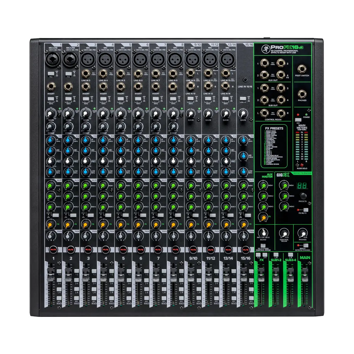 La Mackie ProFX16v3 es una consola de mezclas de 16 canales con 11 preamplificadores de micrófono Onyx con 60 dB de margen dinámico y un motor de efectos integrado con 24 efectos, ideal para sonido en vivo, grabación doméstica y creación de contenido. La interfaz de audio USB 2×4 integrada ofrece grabación y reproducción de alta calidad a 24 bits/192 kHz con monitorización sin latencia.