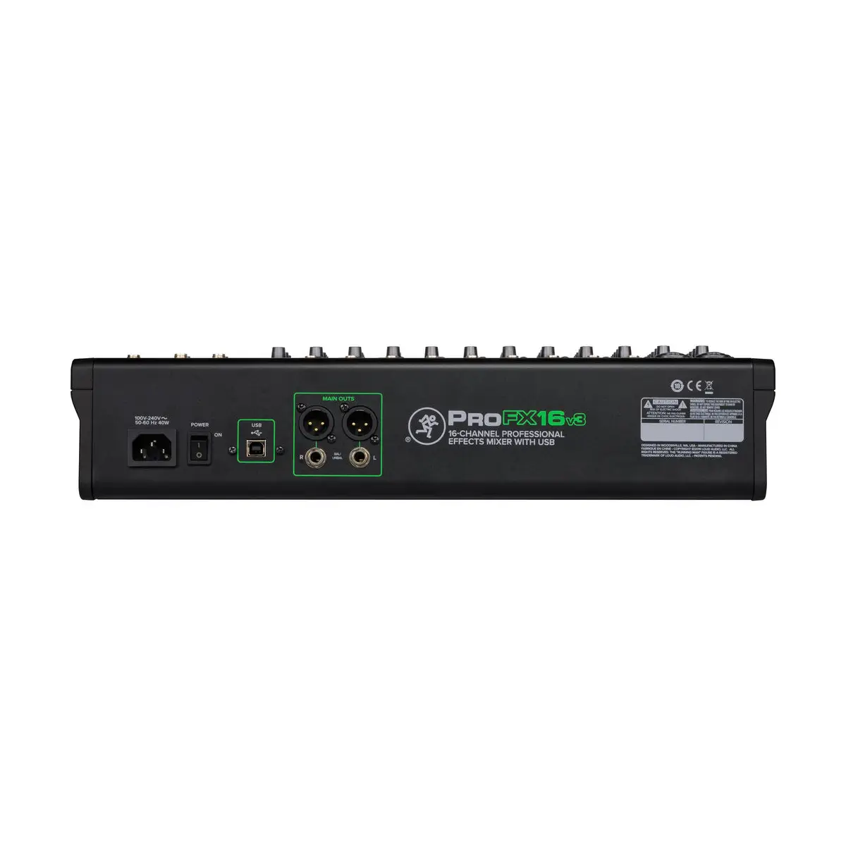 Cada canal incluye selectores de botones para Main L/R, Sub 1-2, Sub 3-4 y PFL SOLO. La sección master del Mackie ProFX16v3 ofrece faders dedicados para Main, Sub 1-2, Sub 3-4 y FX. Las salidas principales incluyen conectores XLR y 1/4″, mientras que las salidas de subwoofer y sala de control utilizan conectores de 1/4″. Una salida de auriculares TRS de 1/4″ incluye su propio control de nivel independiente. Otras características incluyen un control de mezcla de entrada/USB 1-2, una salida de FX dedicada, un fader de nivel de FX y un silenciador de FX, que también se puede controlar mediante la entrada de pedal de 1/4″.