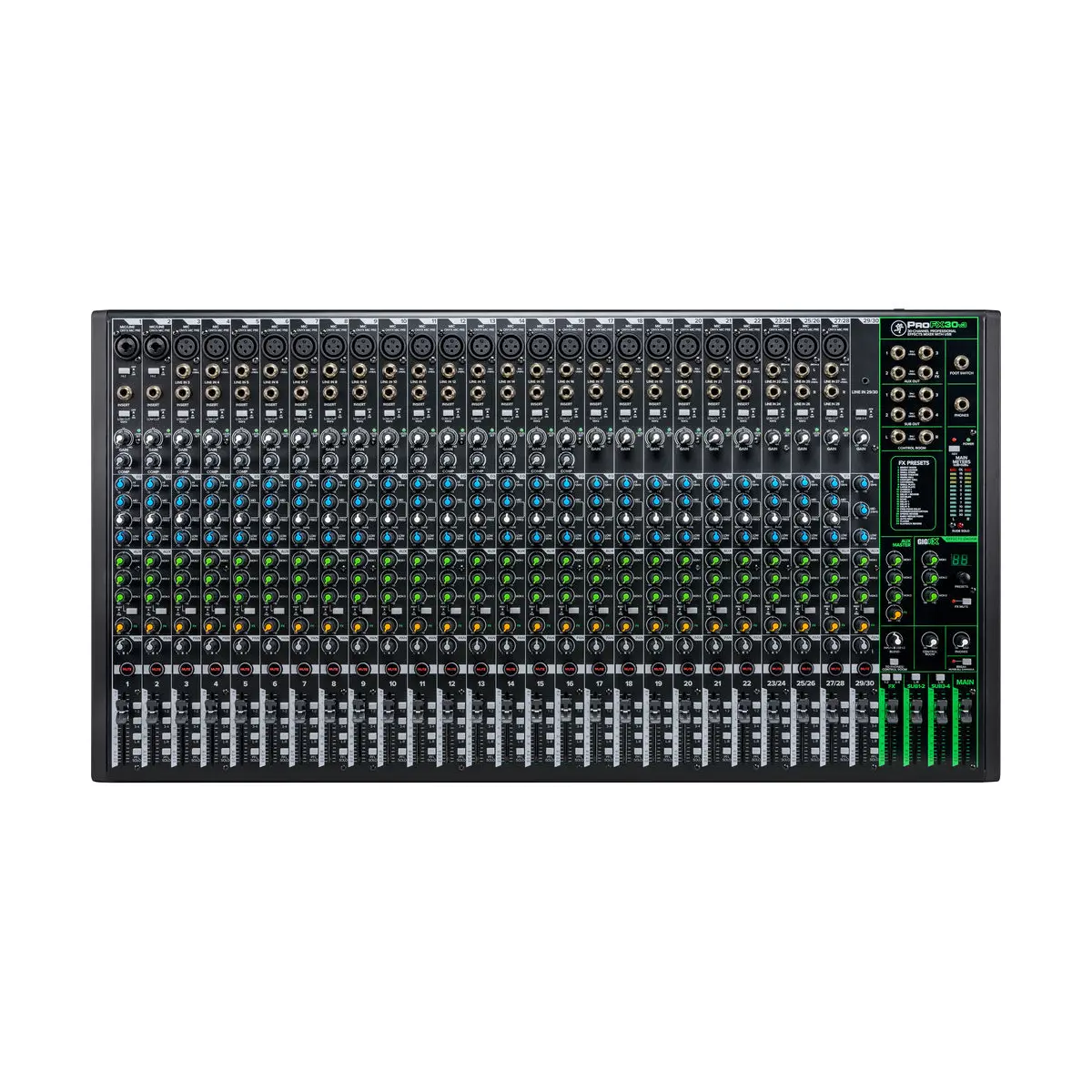 Los canales 1-2 ofrecen conexiones combo XLR-1/4″ de micrófono/línea y un interruptor Hi-Z (para guitarra y bajo), mientras que los canales 3-28 ofrecen entradas XLR o de 1/4″. Los canales 1-16 ofrecen compresores de un solo botón, y los canales 1-22 incluyen inserciones. Los canales 23/24, 25/26 y 27/28 ofrecen dos entradas de línea de 1/4″ cada uno (I y D para estéreo), mientras que el canal 21/22 utiliza una entrada estéreo de 3,5 mm. Los canales 1-30 incluyen controles de ganancia, un ecualizador de 3 bandas, tres envíos auxiliares para monitores, un envío de efectos dedicado, paneo, silenciamiento y faders de nivel. Al activar el interruptor USB 3-4 del canal 29/30, se anulará la entrada de 3,5 mm y se habilitará el retorno USB desde un ordenador.