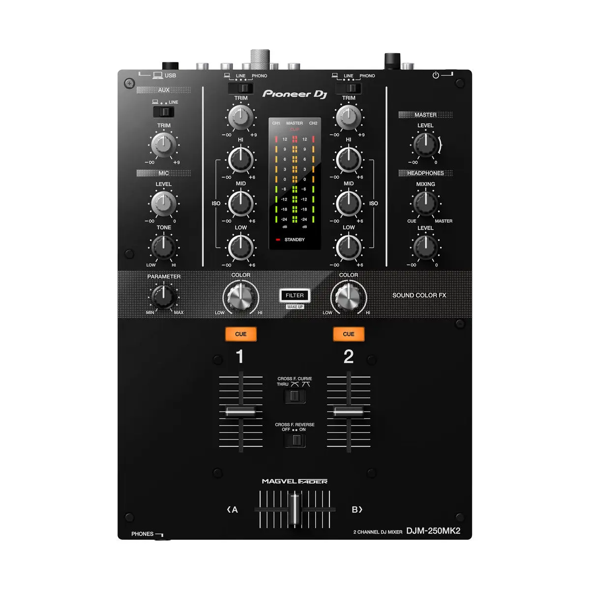 La DJM-250MK2 ha heredado algunas de las características profesionales de la popular DJM-900NXS2, como el crossfader Magvel y el filtro Sound Color FX. Controles sencillos, un diseño claro y aisladores de 3 bandas que te permiten hacer scratch y mezclar de forma instintiva.